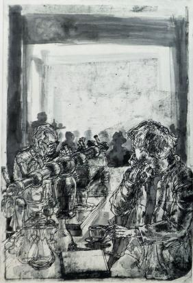 Művész Takáts Márton Év 2001 Technika akvatinta repesztés papír Méret 500 × 330 mm Jelzés jelezve alatta, Café Crème /Repesztés, Lavírozott tus/ Próba, Takáts M, TM 2001 [szárazpecsét] Kategória grafika ID 003583