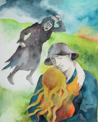 Title var "Sorrow and woe to Iluska's foul stepmother" Artist Péreli Zsuzsa Creation year 2006 Technique aquarelle paper Size 340 × 300 mm Sign signed bottom right, Péreli Zsuzsa Genre graphics ID 002880 Published Petőfi Sándor: János vitéz. Magvető, Budapest, 2007. Élet-Kép-Regény. Péreli Zsuzsa életmű-kiállítás. Kovács Gábor Művészeti Alapítvány, Budapest, 2008. 148.