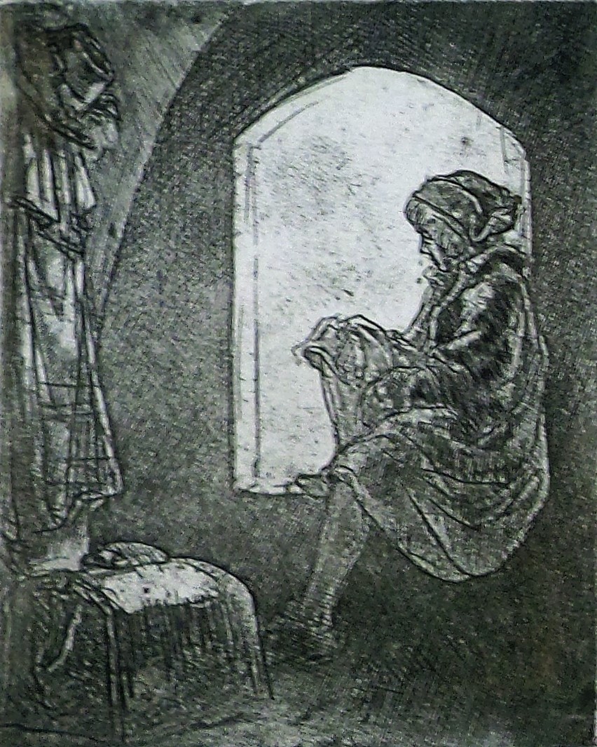 Artist Takáts Márton Creation year 1997 Technique copperplate paper Size 100× 80 mm Sign signed at the bottom, "A postakocsira várva" /Rézkarc, Aquatinta/ E.A., Takáts M, TM '97 [szárazpecsét] Genre graphics ID 003485